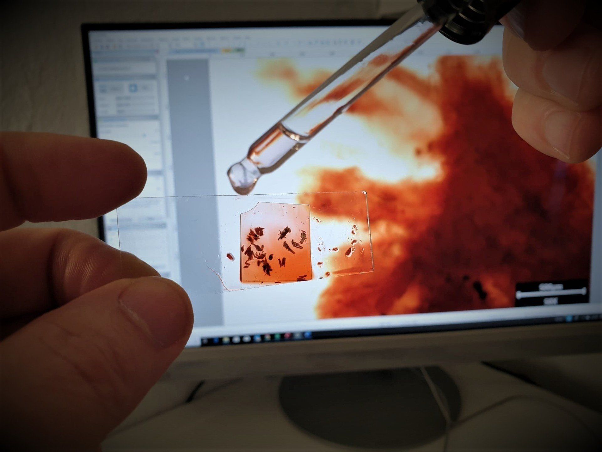 - 2ème examen sur coupe mince en microscopie optique LEICA (variable x100 à 2500) à lumière transmise, si besoin en DIC, notamment pour l'identification des spores de champignon ou la structure complexe du système hyphal.